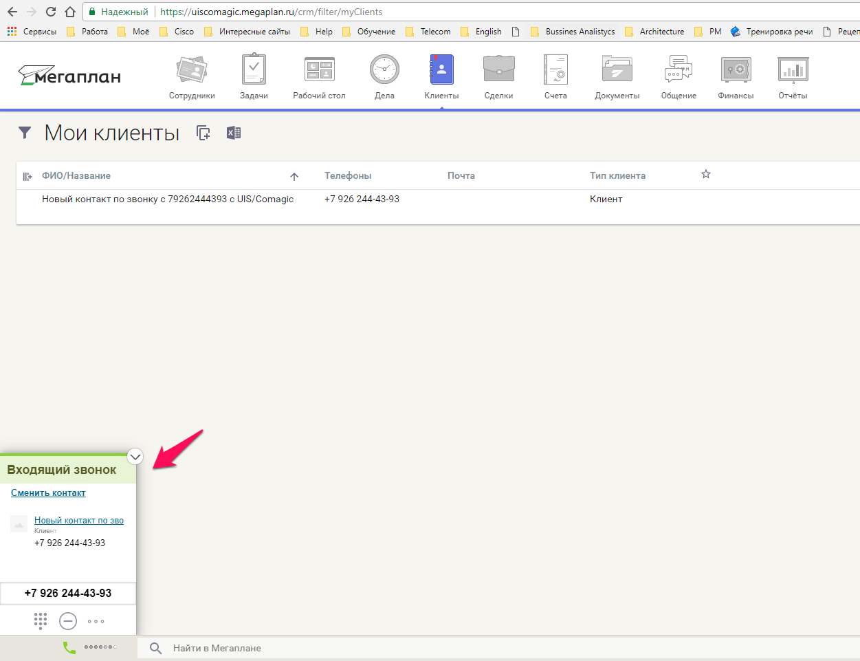 При входящих звонках на экране у сотрудника, до которого происходит дозвон, отображается всплывающая карточка контакта.
