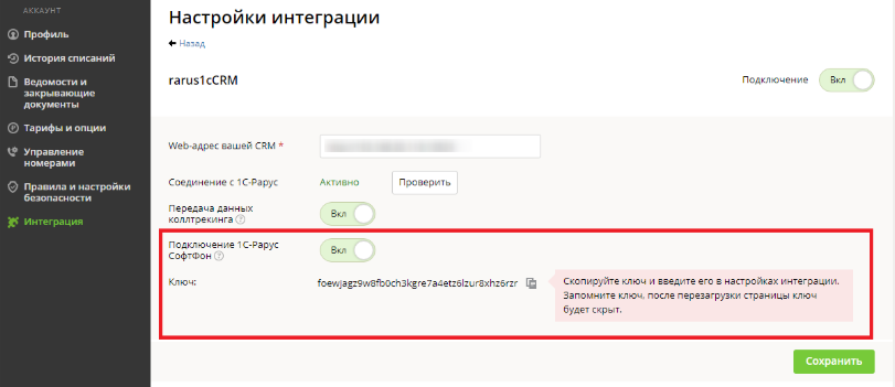 Если создание ключа произведено успешно, то появится соответствующая надпись, а сам ключ добавится в список ключей retailCRM.
