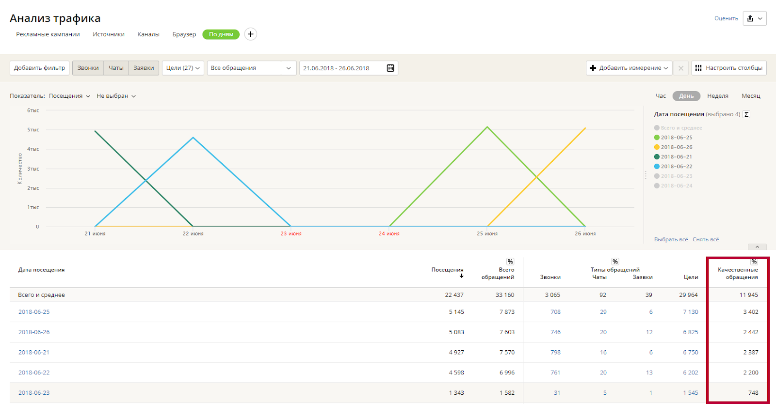 Всего обращений — количество всех обращений или процент всех обращений к количеству посещений в компанию за указанный период. Включает данные по звонкам, чатам, заявкам и целям.