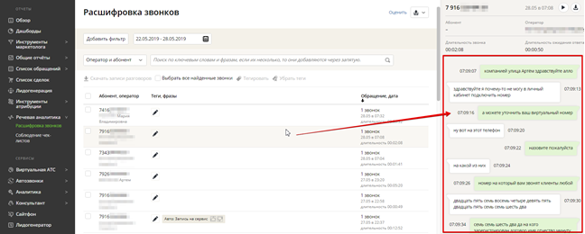 3. Выберите в строке звонков разговор, который хотите проанализировать. При нажатии на него в правой части экрана появится расшифровка звонка.