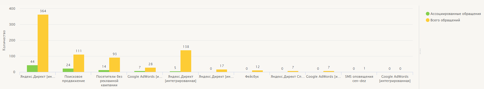 Обращения в разрезе по Рекламной кампании строятся по рекламной кампании из сессии. Если не удалось связать обращение с сессией и посетителем, либо если у посетителя не было сессий в пределах ретроспективного окна, то данное обращение попадает в Рекламную кампанию, определенную по номеру телефона.