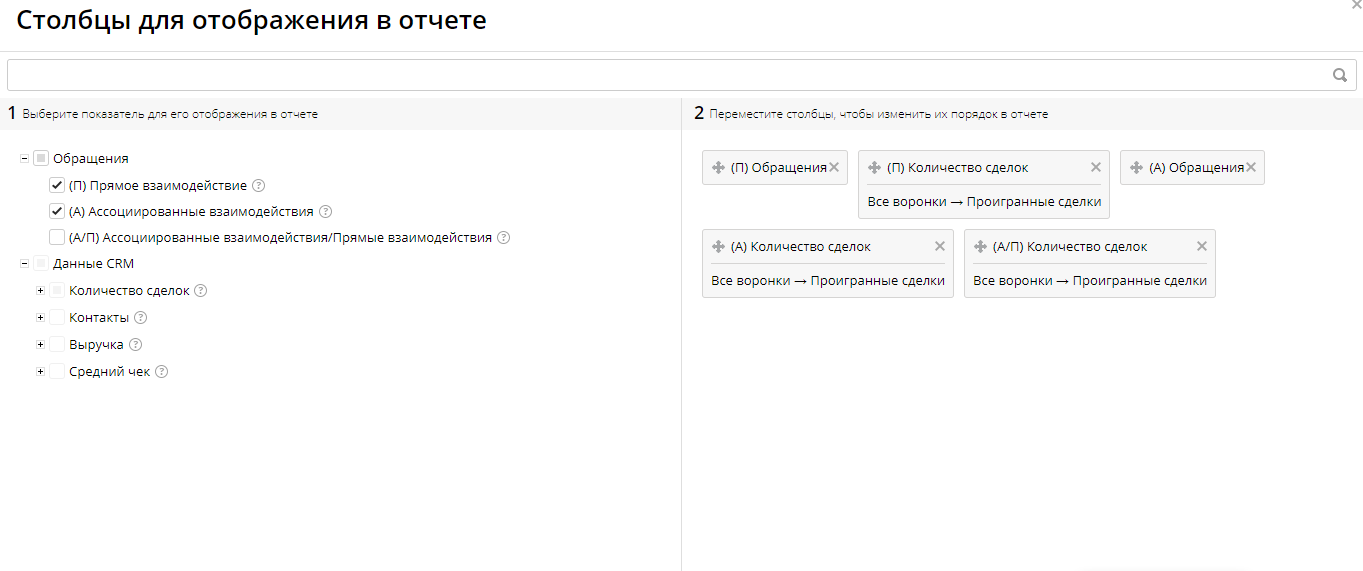 Контакты* — количество контактов по воронке или на конкретном этапе из вашей CRM системы полученных по прямому или ассоциированному взаимодействию, а также их отношение.