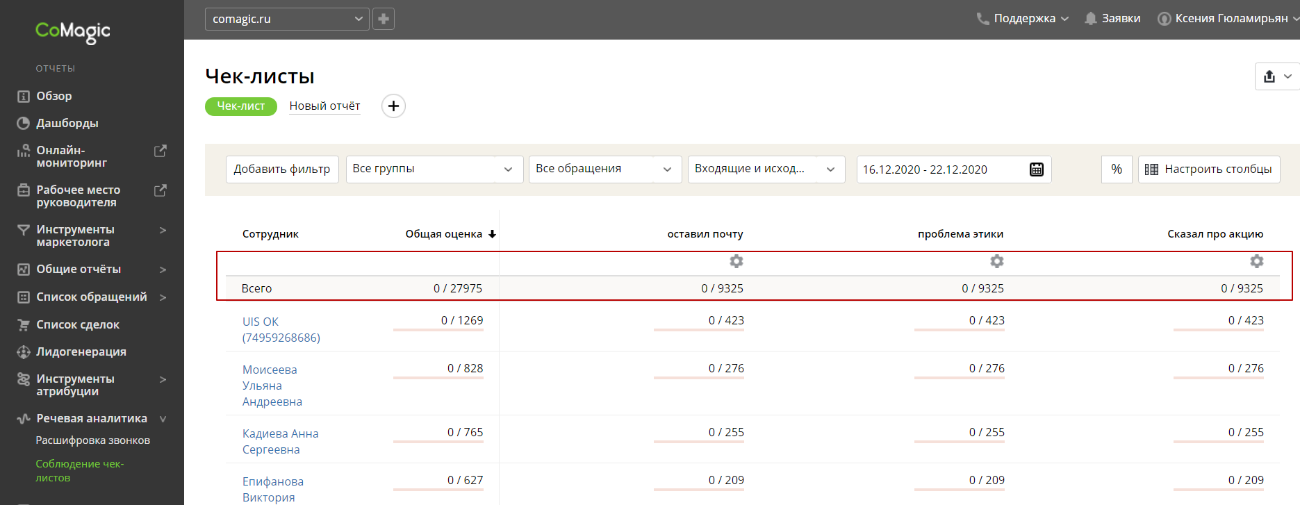 Строка «Всего» в столбце «Сотрудники» отражает отношение общего количества раз, когда должны были быть сказаны фразы из чек-листа, к количеству сказанных фраз по всем сотрудникам.