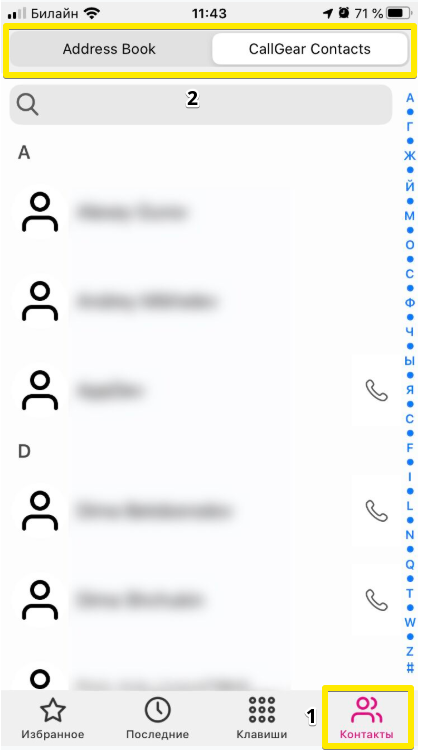 Если вы хотите позвонить абоненту из списка контактов телефона, перейдите на вкладку Контакты и выберите Adress Book, если вы хотите позвонить своему коллеге, выберите CallGear Contacts: